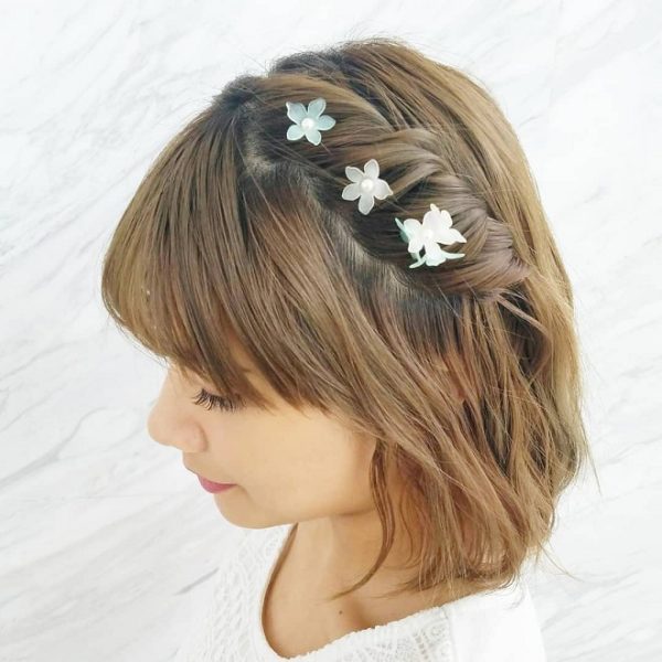 Mái tóc ngắn khi được điểm xuyết với một lọn tóc tết ngắn cũng hòa hợp vô cùng với tổng thể bộ trang phục. Kiểu tết tóc cô dâu tóc ngắn Hàn Quốc sẽ để lại ấn tượng nơi người khác về một vẻ đẹp đơn giản nhưng tinh khôi vô cùng.